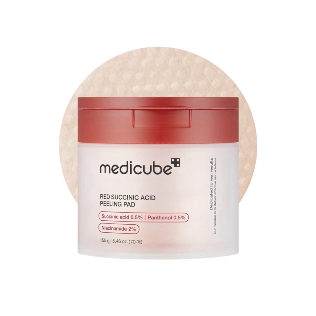 O Medicube Red Succinic Acid Peeling Pad 155g é um pad esfoliante desenvolvido para tratar acne, controlar oleosidade e refinar a textura da pele. Cada disco é embebido em uma solução potente que combina ácido succínico, ácido salicílico (BHA), niacinamida, pantenol, alantoína e antioxidantes, criando um tratamento completo para limpeza de poros, renovação celular e uniformização do tom. Os pads possuem dois lados: o lado texturizado promove esfoliação eficaz e ajuda a desobstruir poros, enquanto o lado liso deposita a essência calmante e hidratante. O uso regular reduz cravos, espinhas, oleosidade excessiva e marcas pós-acne, deixando a pele mais lisa, uniforme e saudável.