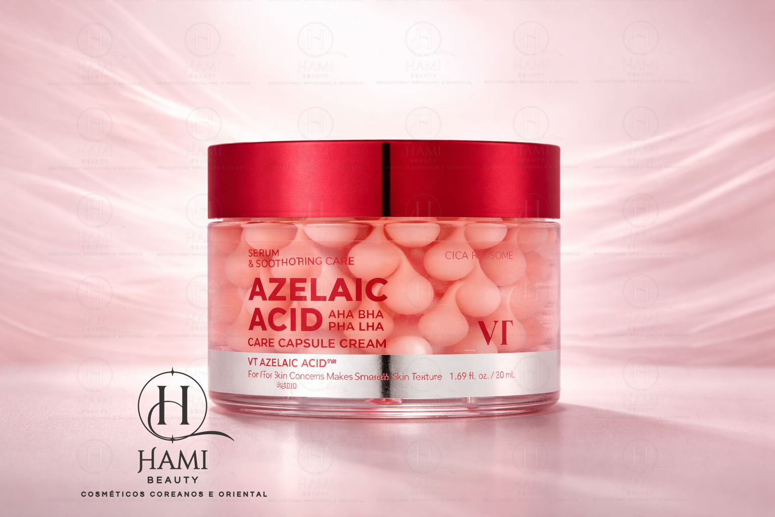 O VT Azelaic Acid Care Capsule Cream é um creme facial inovador que combina cápsulas concentradas com ativos poderosos como Ácido Azelaico, AHA, BHA, PHA e LHA, proporcionando um tratamento completo para acne, oleosidade e textura irregular da pele.